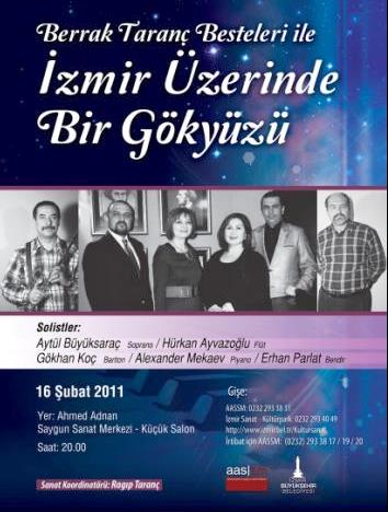 İzmir’in gökyüzü E.Ü. DTM Konservatuarı Öğr. Üyesi Prof. Berrak Taranç’ın ezgilerinde söz buldu. 16 Şubat 2011 tarihinde İzmir Ahmet Adnan Saygun – Sanat Merkezi’nde icra edilen konserde, bütün eserleri basılan ilk Türk bestecisi Selman Ada’nın “Der Eurhythmus” isimli bestesinin dünya prömiyeri gerçekleştirildi. Ezgi ve sözleri Berrak Taranç’a ait 10 yapıt soprano Aytül Büyüksaraç, bariton Gökhan Koç, piyanist Alexander Mekaev, flüt sanatçısı Hürkan Ayvazoğlu ve bendir sanatçısı Erhan Parlat tarafından seslendirildi…