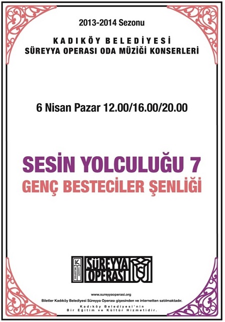 Yedi yıldan bu yana uluslararası çoksesli müzik alanında genç bestecilerimizi ve yapıtlarını tanıtma amacına yönelik olarak düzenlenen “Sesin Yolculuğu - Genç Besteciler Şenliği” bu yıl 06 Nisan 2014 Pazar günü Kadıköy Belediyesi Süreyya Operası’nda izleyicileriyle buluşacak. Saat: 12.00 / 16.00 / 20.00′de… Program kitapçığı: